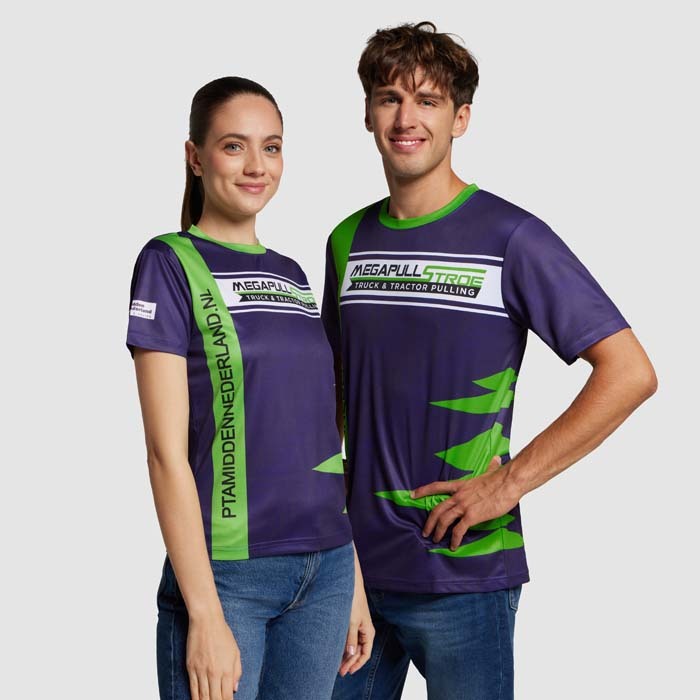 T-shirt promotionnel à col rond en polyester avec sublimation. Disponible avec impression de noms/numéros individuels. A partir de 10 pièces.