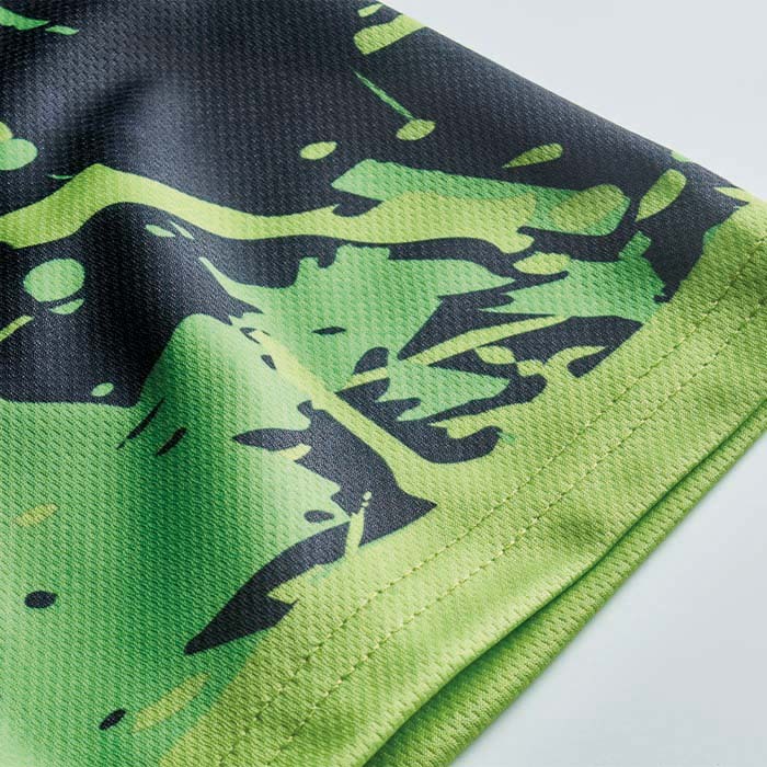 T-shirt sublimé col rond en coton polyester avec impression allover sur le devant, le dos et les manches.